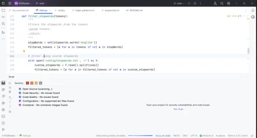 The Snyk panel at the bottom of my PyCharm editor illustrates the use of the scanning process as the plugin performs tests for critical, high, medium, and low-level vulnerabilities.