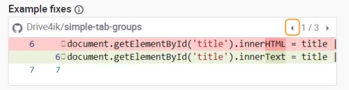 The accompanying fix analysis provides a recommended fix to the code.